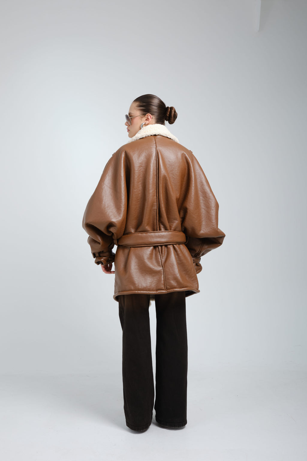 Chaqueta oversize en cuerina café con interior ovejero. Cuello amplio, mangas con hebillas ajustables y cinturón para entallar la silueta.