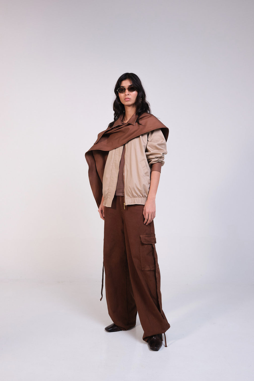 Chaqueta beige en dril con cuello y muñecas en cuerina y color camel, viene con una capucha en cuerina y color camel.