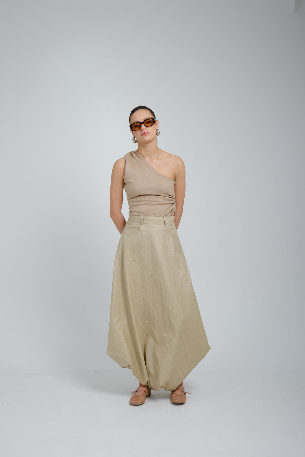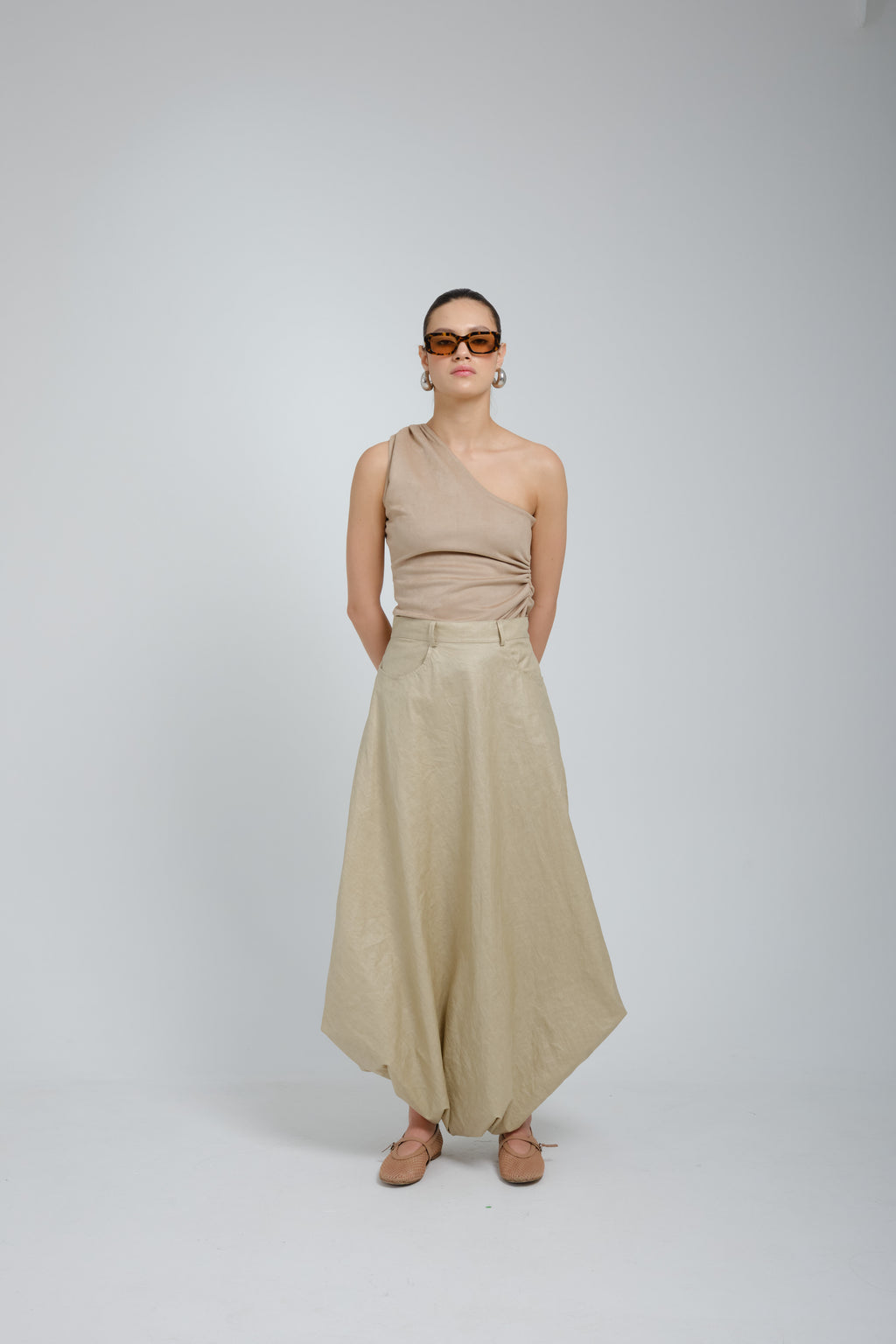 Falda pantalón beige, con resorte en la parte inferior, bolsillos al costado, pretina y cremallera con botón en costado izquierdo como sistema de cierre.