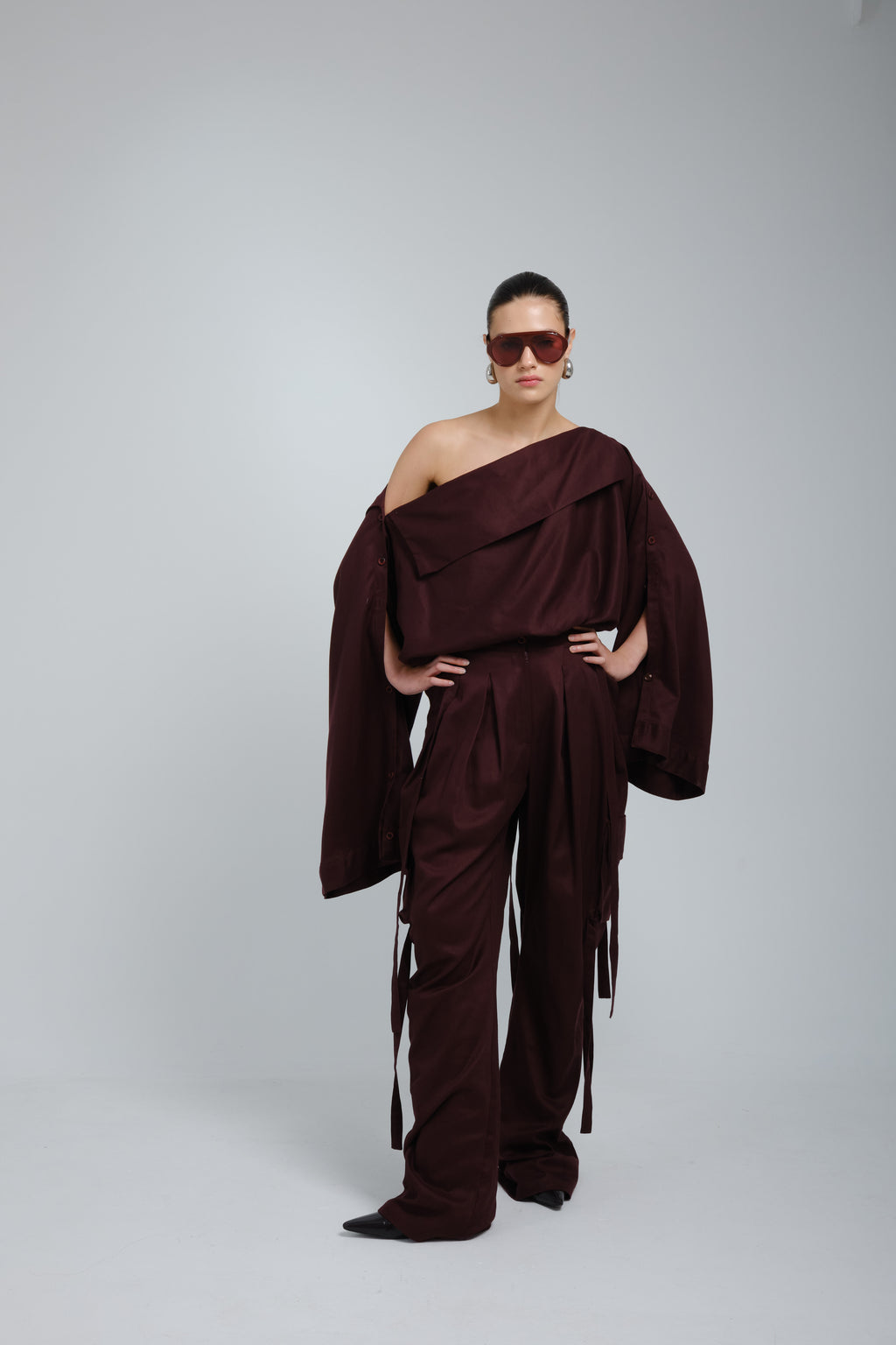 Pantalón en tencel vino tinto ancho cargo, con prenses en la parte delantera, con pretina y botón con cremallera como sistema de cierre, con bolsillos diagonales, y bolsillos parche en costados a la altura de la rodilla con tiras colgando.