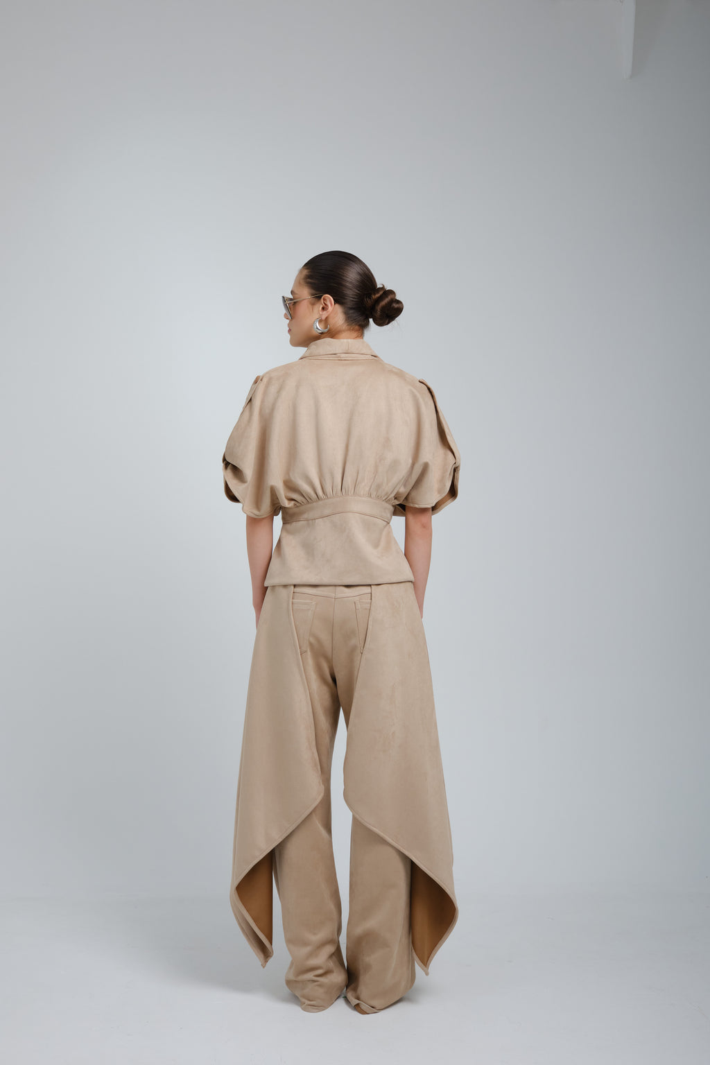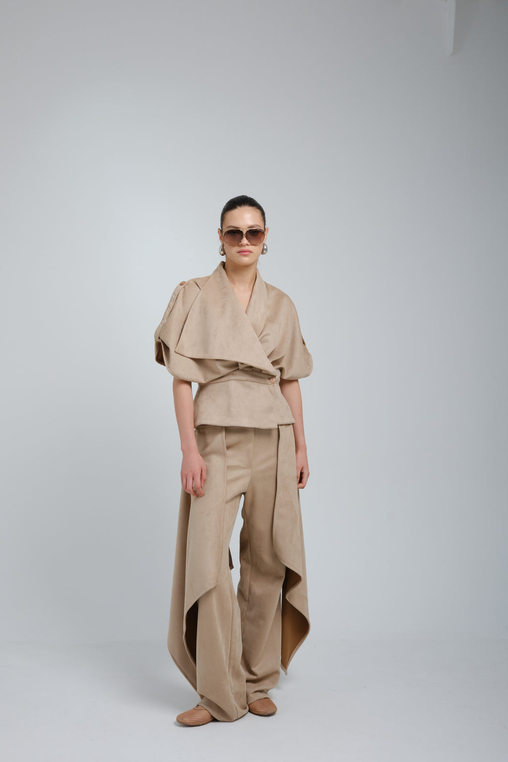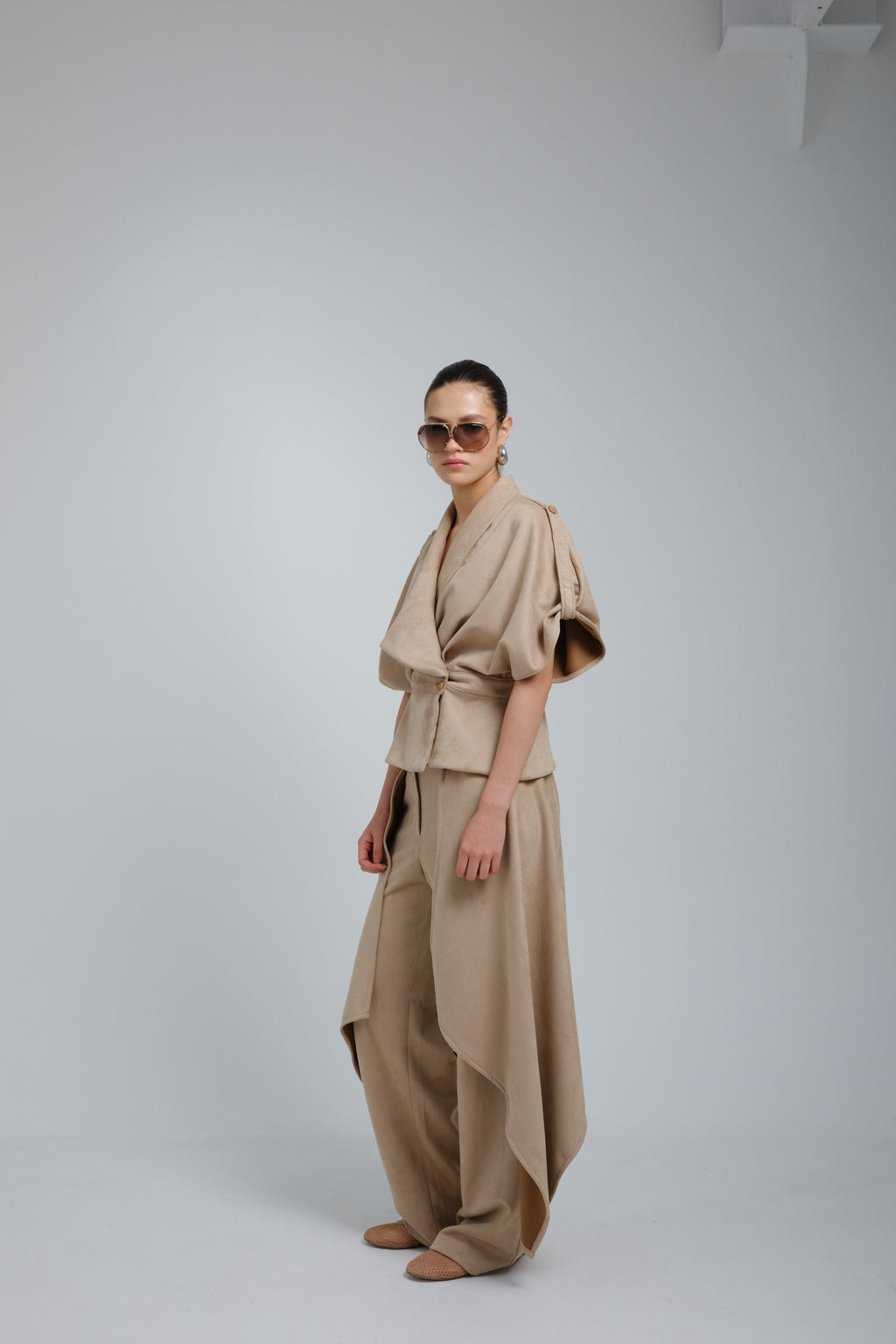 Camisa oversized en gamusa beige, asimetrica, con manga caida, cuello grande, entallada en cintura, con botón como sistema de cierre.